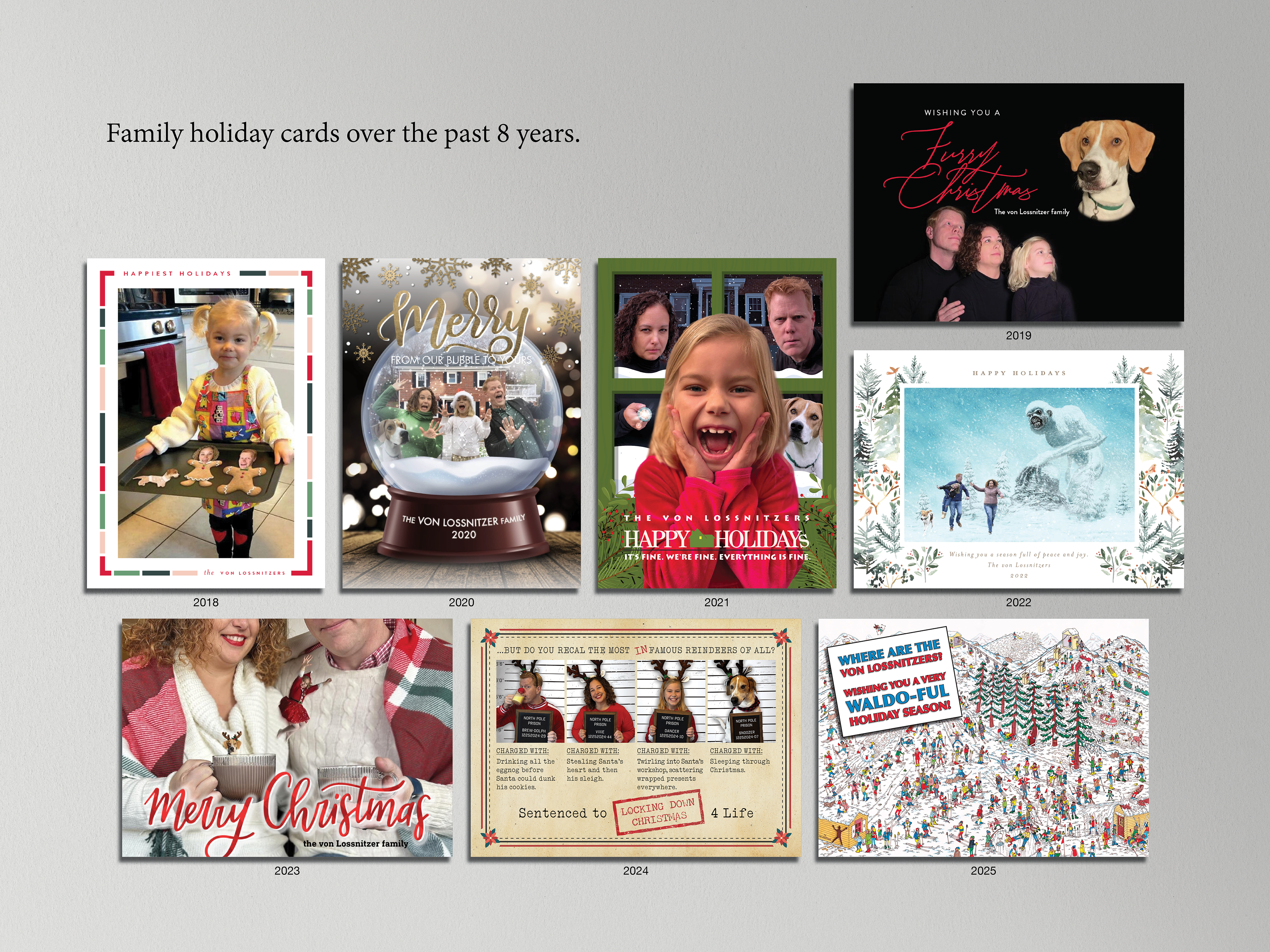 Creating our family’s annual holiday card is one of my favorite traditions. Each year brings a new idea, a playful photoshoot, and lots of laughter as we try out costumes, props, and silly poses. My daughter has loved being part of it from the very beginning and has quickly become my biggest (and littlest) art director, offering her honest and often hilarious feedback. Together, we turn each card into a little adventure, and it has become a joyful way to share a bit of our family, creativity, and holiday cheer with the people we love.